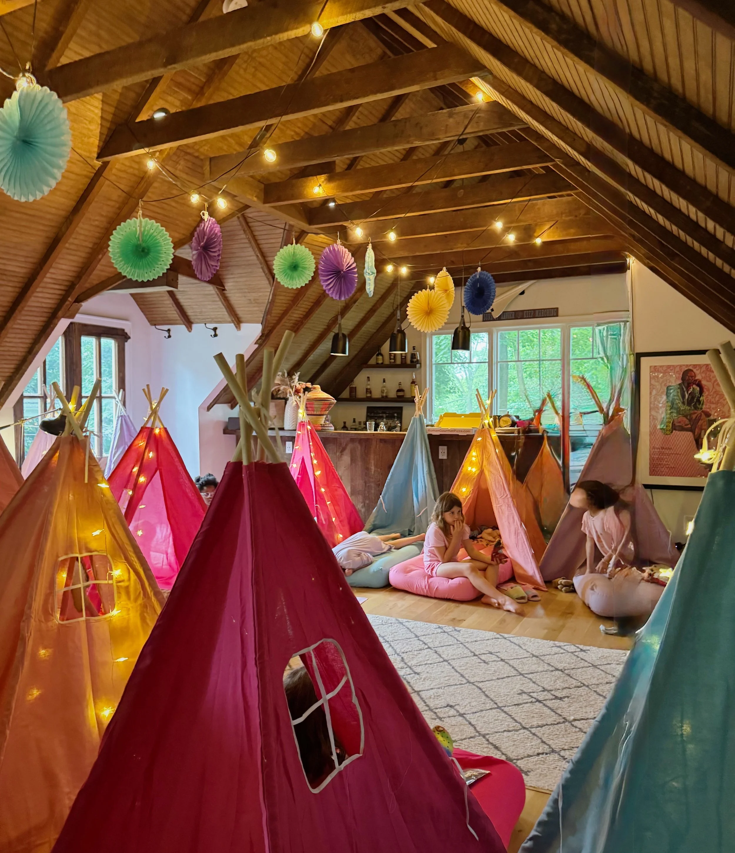 All the fun of a sleepover without sleeping over! This one-of-a-kind Art Barn experience features a cozy campout in our loft, where guests enjoy pizza and a parent-selected movie beneath the gentle glow of the barn lights. Before heading to the loft, children will decorate their own cupcakes, then conclude the evening with a collaborative craft honoring the birthday child, singing happy birthday, and savoring their decorated cupcake creations.